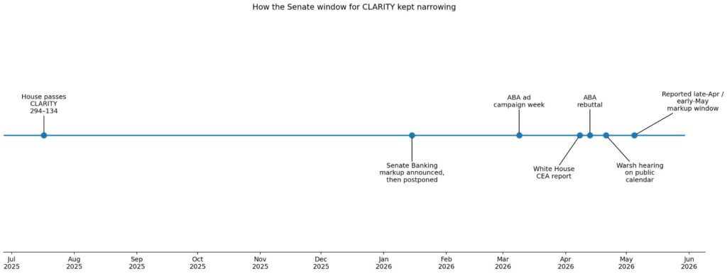 The bank lobby’s escalation, the White House’s quantitative rebuttal, and the Senate’s public silence on a new markup date all point to the same variable that yield language must close in days for CLARITY to reach markup before the campaign season consumes the floor schedule.