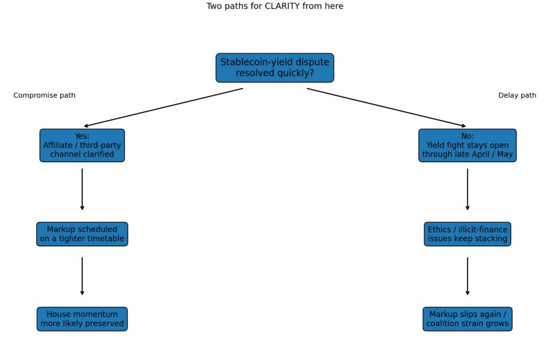 The harder path is already visible in the Senate’s public calendar. If banks conclude that maintaining the current position yields better long-run terms than accepting a partial win, the yield fight will stay alive through May.