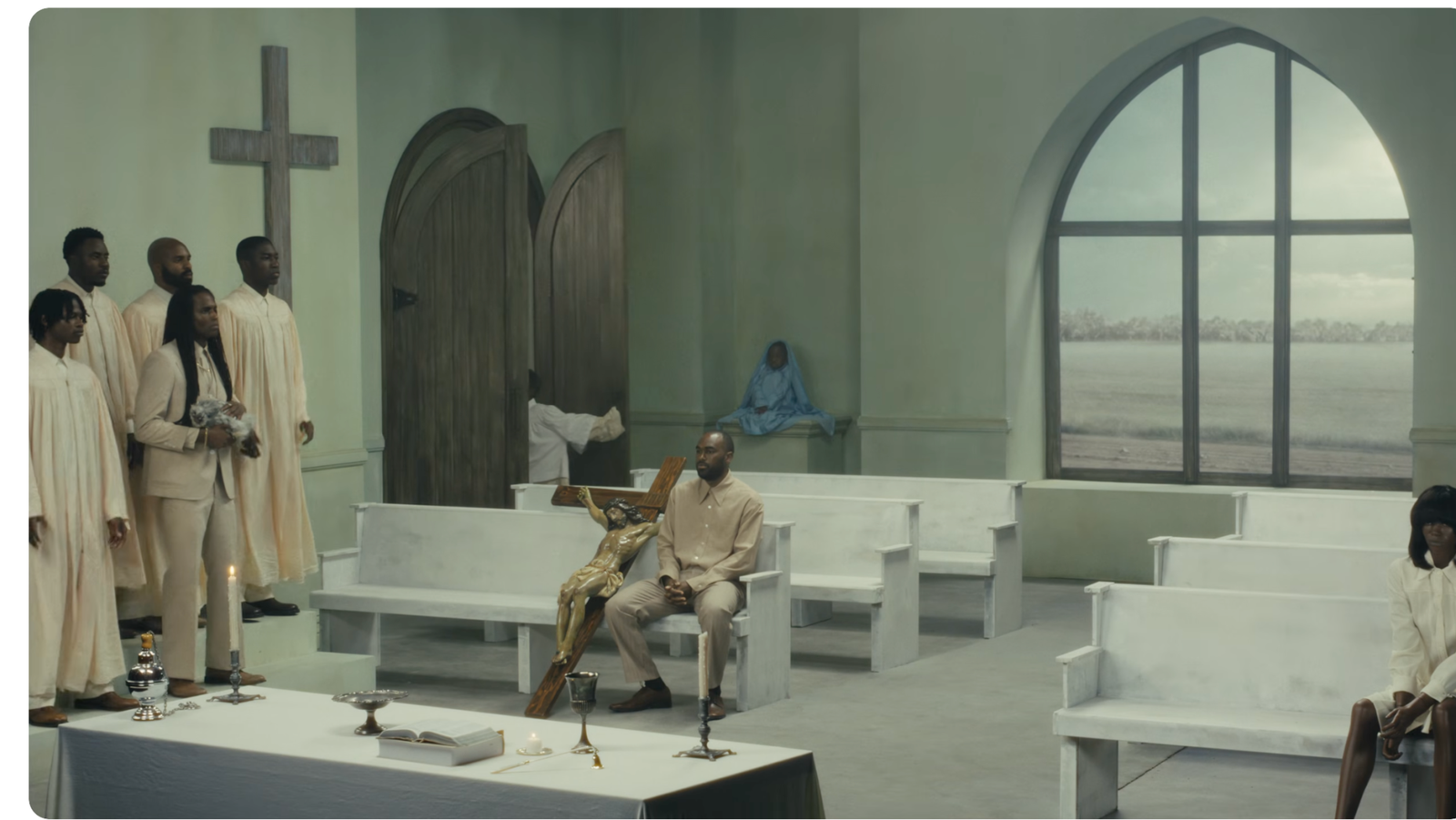 The set, as the psyche of Censori’s vision, is a church interior. Each parishioner seems symbolic (a girl in a blue veil seated in the background; a woman with a magician; the late King of Pop pulling focus in the back row), and the actions seen here are the rituals that define and control us. Scott and Ye are interchangeable men: the latter with his classic thousand-mile stare, the former confidently wedding two women at once. They are also alien beings, their spaceship landing and blasting off in the background. Meanwhile, a sleeping nun is hauled off by two cops; a child trips a chef delivering a massive cake. In Censori’s debut, the rituals of religious life and the looming terror of dystopian control take center stage, drifting in and out. The whole clip is captured in a single, continuous take.
