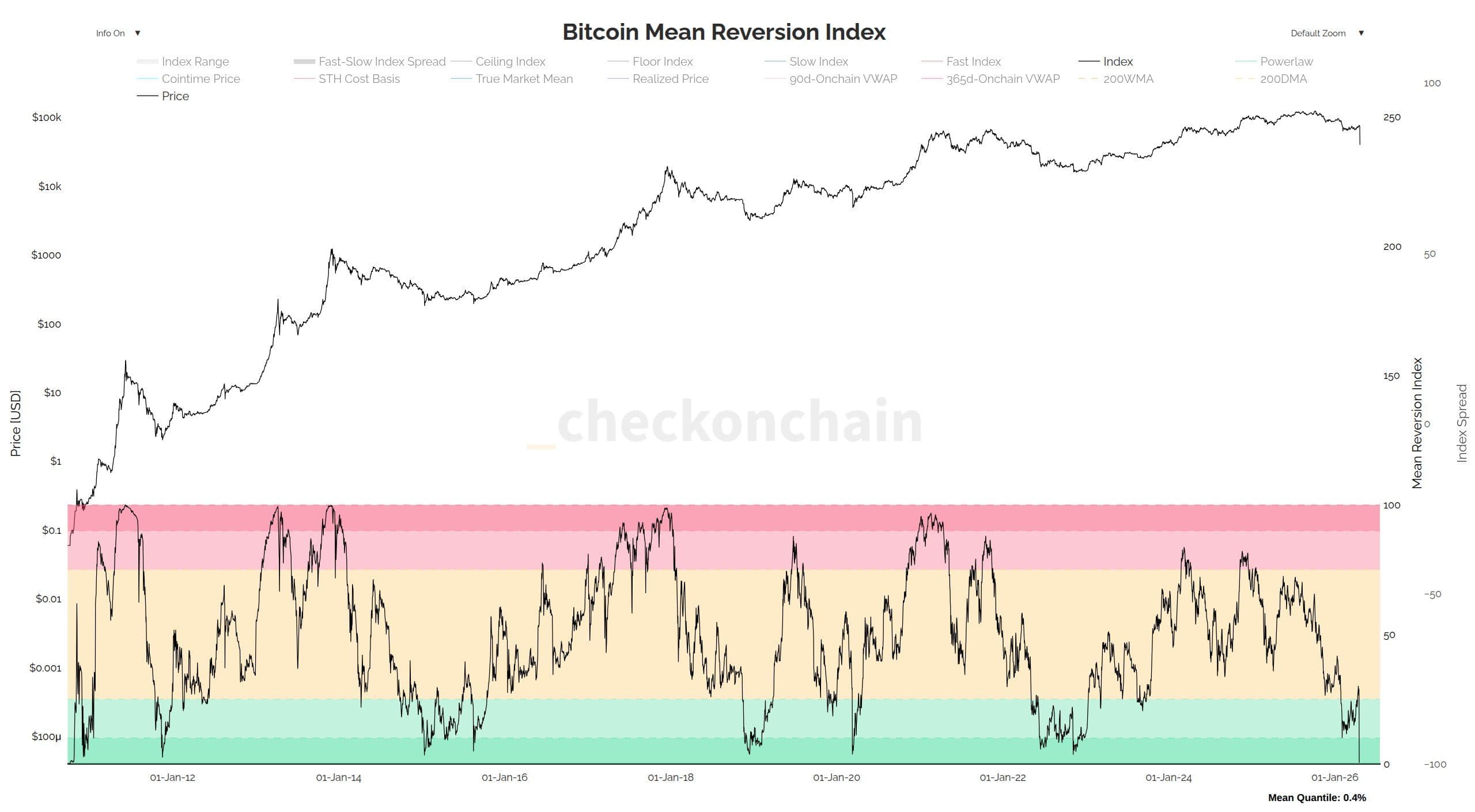 Check points to the Bitcoin Mean Reversion Index, a composite model that averages multiple key valuation metrics, including the 200-week moving average, realized price, power law trend and a number of volume-weighted average price measures. The index ranks bitcoin’s price on a historical percentile basis.