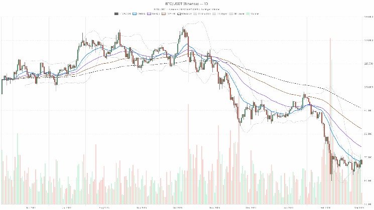 $BTC/USDT — daily chart with candlesticks, EMA20/EMA50 and volume.