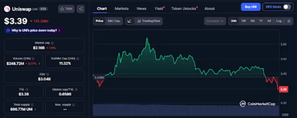 That stability did not hold into the final stretch. $UNI fell again and moved below the earlier consolidation band, ending near the session’s lower area. The latest decline pulled the price under $3.40 as weakness returned late in the period. Market capitalization stood at $2.16 billion, while 24-hour volume reached $248.72 million. Uniswap price recorded an early rebound, a mid-session fade, and a sharper late pullback.