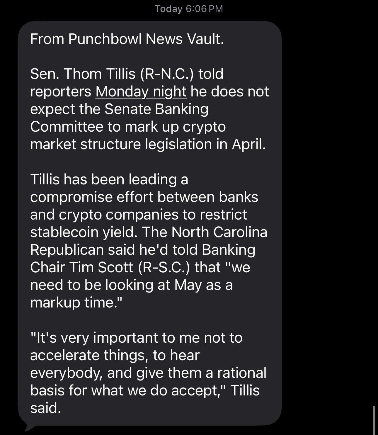 US Republican Thom Tillis of North Carolina told reporters Monday that he does not expect the Senate Banking Committee to mark up the legislation, also known as the CLARITY Act, in April and has recommended that Scott schedule it for next month, according to Punchbowl News.